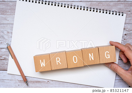 「WRONG」と書かれた積み木、ノート、ペン、人の手