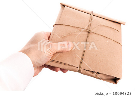 Male hand delivers envelope tied with a rope isolated on white background