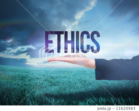 Businesswomans hand presenting the word ethics