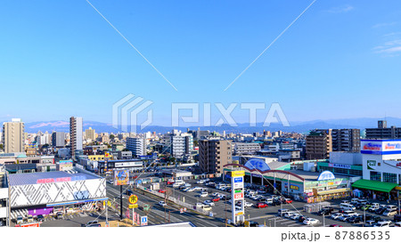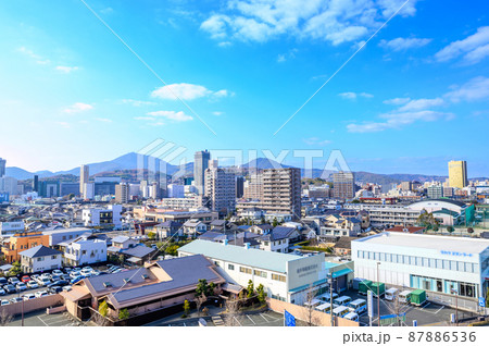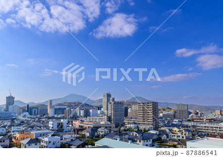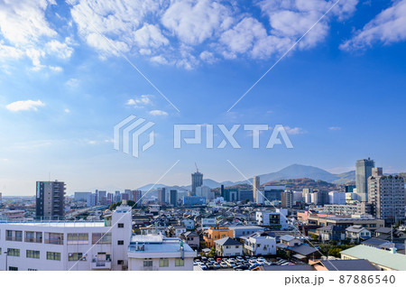 (阿蘇山) 山並みを背景に映える都市景観・ビル風景(熊本市世安町)
