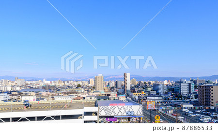 (駅前高層ビル・都市景観) 金峰山・山並みを背景に映える駅前周辺パノラマ風景(熊本市世安町)