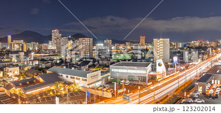(夜景都市景観) 金峰山・山並みを背景に映える駅前周辺パノラマ風景(熊本市世安町)