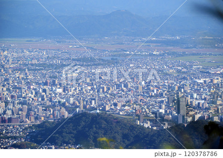 (金峰山・都市景観) 山並みを背景に映える都市景観パノラマ風景(熊本市世安町)
