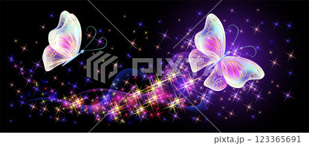 Flying delightful butterflies with sparkle and blazing trail flying in night sky among shiny glowing stars in cosmic space. Love and romance concept.