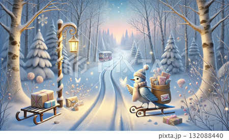 雪の森で手紙を届ける青い小鳥の郵便屋さんと幻想的な冬のバス停のファンタジーイラスト