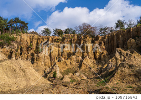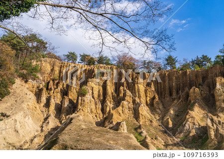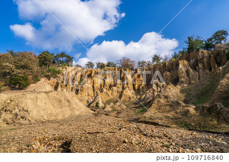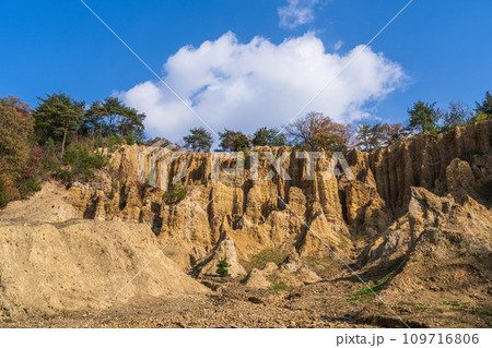 秋雲と青空を背景にした阿波の土柱を下から見上げた風景 Ver1