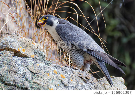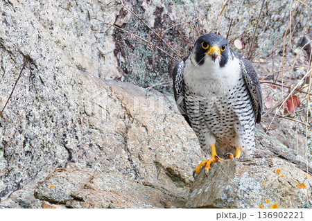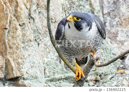 崖の岩に立つハヤブサ