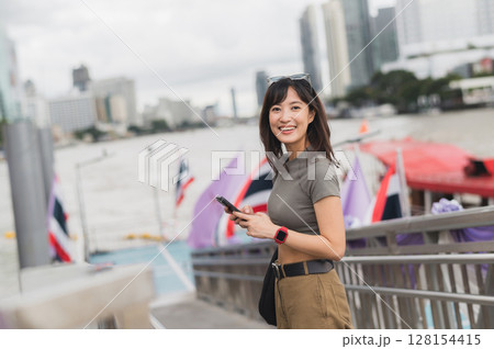 Smiling young southeast asian woman teenager blogger world travel explorer using smartphone searching tourism guide. Local cultural experience concept in Asia by Chao Phraya River Bangkok