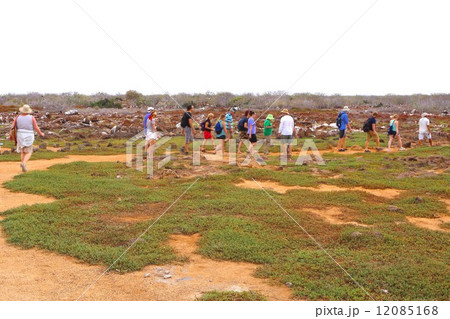 ガイドの案内で世界遺産第一号ガラパゴス諸島を探検する観光客