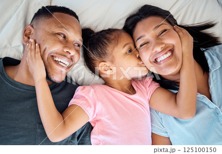 Happy family, kid kiss and bed with a girl, mother and father with a smile, love and parent care. Happiness, hug and black family in a bedroom lying relax together in a morning with a child at home