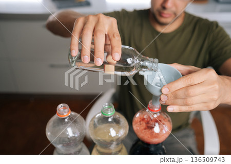 Cropped shot of gardener pouring water into funnel placed on top of plastic bottle, preparing homemade fertilizer for nurturing plants, demonstrating sustainable gardening practices