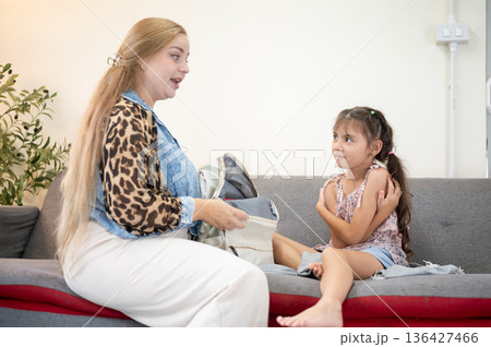 Caucasian whites mother holding a bag talking to kid daughter while sitting on sofa in living room