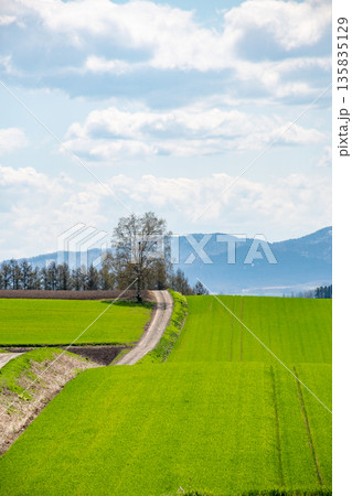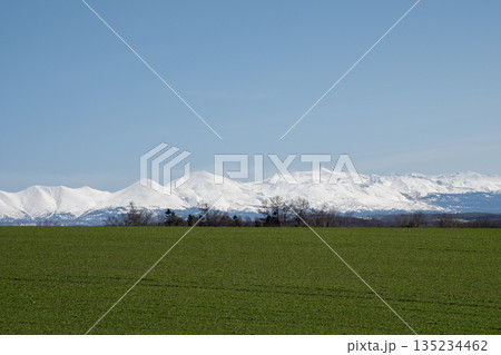 春の晴れた日の緑のムギ畑と雪山の連山 十勝岳連峰