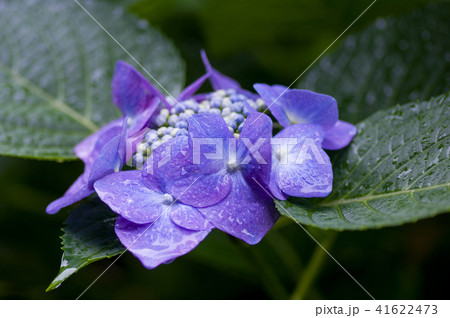 紫色の装飾花を付けた手毬咲きのアジサイの花房をクローズアップで撮影した写真