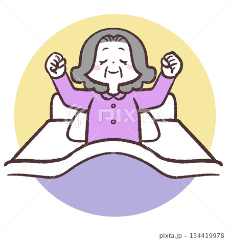 両手を上げて万歳する笑顔のシニア女性 上半身イラスト