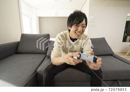 最新テレビゲーム機に夢中になる男性/プレステ/リビング