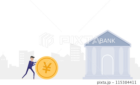 大金を転がして銀行まで運ぶ笑顔の日本人ビジネスマン