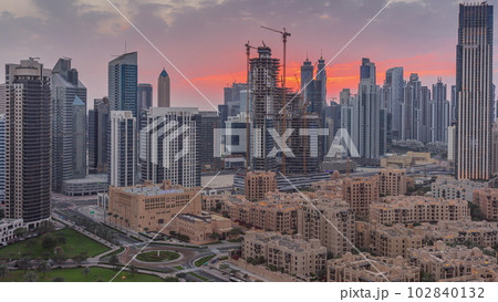 Dubai's business bay towers at sunset aerial timelapse. Rooftop view of some skyscrapers