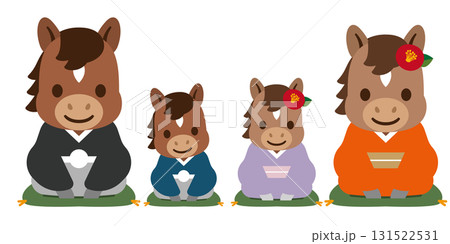馬の家族 着物姿の親子セット 年賀状用のイラスト素材
