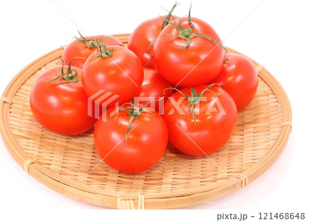 中くらいのサイズのトマト 複数 ざる 明るい背景