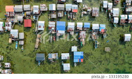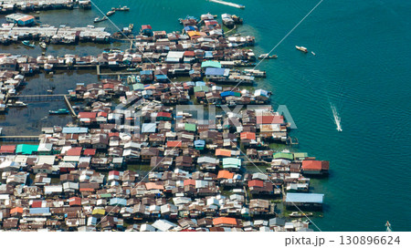 Aerial view of houses located on the water in the city of Semporna. Borneo, Sabah, Malaysia.