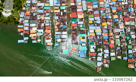 Aerial view of fishing village with wooden houses on stilts in the sea. Sandakan, Borneo. Malaysia.