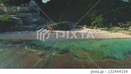 Aerial drone view of a beautiful beach in Bali, Indonesia, showing tourists relaxing on the sand, swimming in the crystal-clear turquoise water, and enjoying the stunning coastal scenery