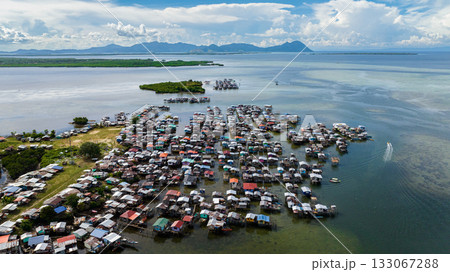 Aerial view of village of fishermen and farmers on the water in Asia. Borneo,Semporna. Sabah, Malaysia.