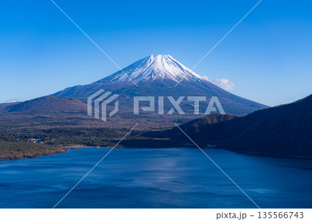 天子山地の中之倉峠展望台より望む富士山と紅葉の本栖湖に映る逆さ富士と竜ヶ岳