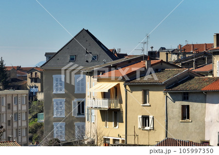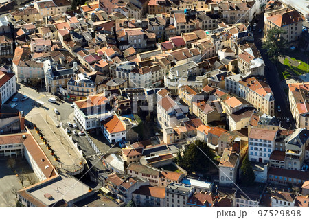 Aerial view of dense historic center of Thiers town in Puy-de-Dome department, Auvergne-Rhone-Alpes region in France. Rooftops of old buildings and narrow streets