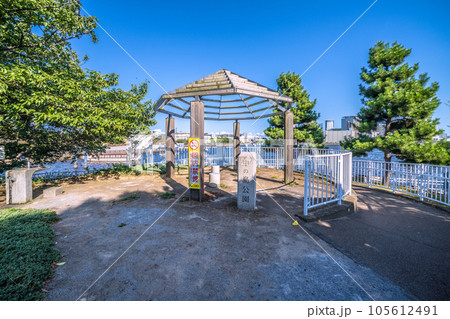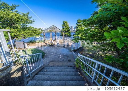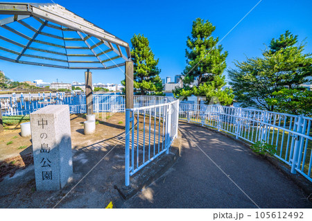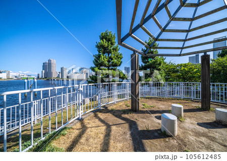 日本の東京都市景観 相生橋たもとの江東区立「中の島公園」などを望む(画面右奥は豊洲)