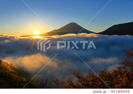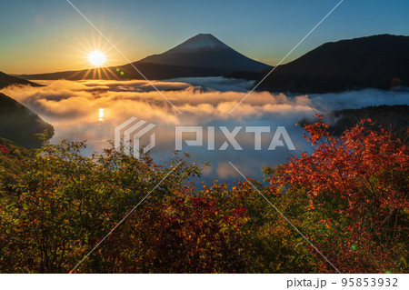 日の出に輝く紅葉と雲海の本栖湖と富士山