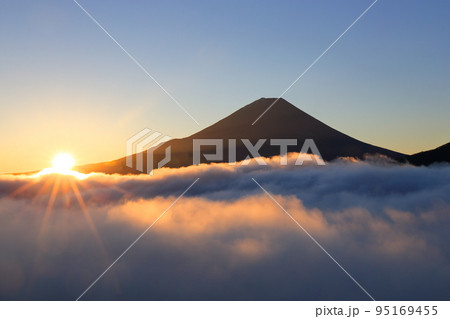 日本の夜明け 本栖湖の湧き出る雲海と日の出