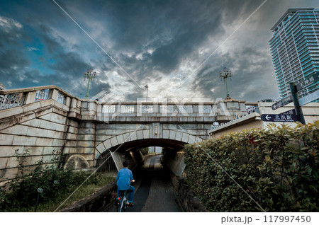 難波橋通り抜け遊歩道と自転車、7月10日、日本