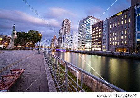 土佐堀川に架かる栴檀木橋からの夕景、リフレクション、1月17日、日本