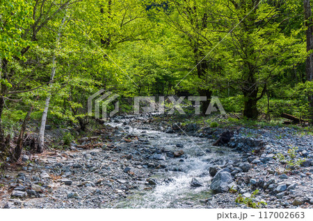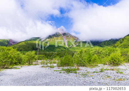 日本屈指の山岳リゾート 新緑の上高地 中千丈沢の押し出し