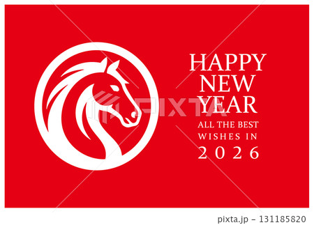 2026年 馬のイラスト年賀状 赤の背景とシンプルな賀詞デザイン 横