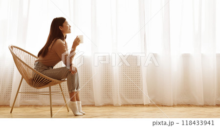 Calm Morning. Girl Sitting In Modern Chair, Enjoying Coffee In Front Of Window, Side View