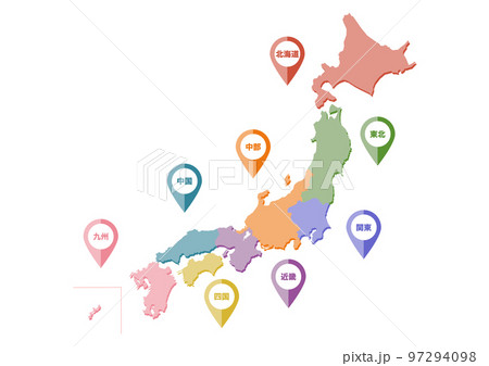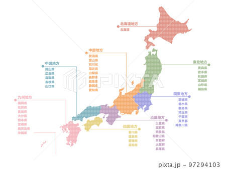 日本地図のイラスト: 日本の地方区分(ドット背景)