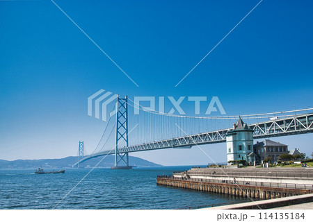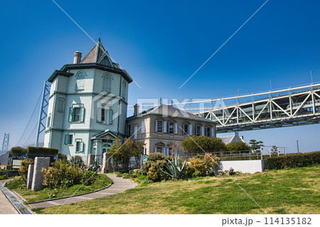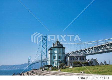 孫文記念館(重要文化財)と明石海峡大橋
