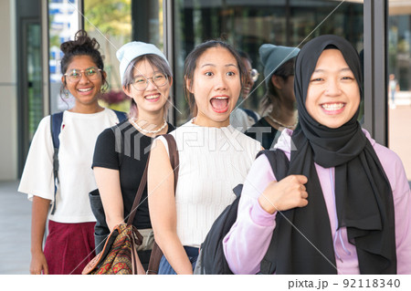 Group of happy young women standing in a row.