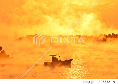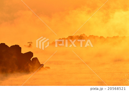 久礼湾の日の出 朝焼けに染まる気嵐 (高知県 中土佐町)