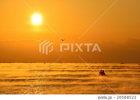 久礼湾の日の出 朝焼けに染まる気嵐 (高知県 中土佐町)
