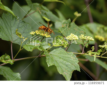 生き物 昆虫 コガタスズメバチ、オオスズメバチより一回り小さいスズメバチ。姿はオオスズメバチそっくりです②