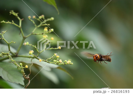 生き物 昆虫 コガタスズメバチ、後脚を上げて飛翔中の働き蜂。オオスズメバチより頭でっかち?