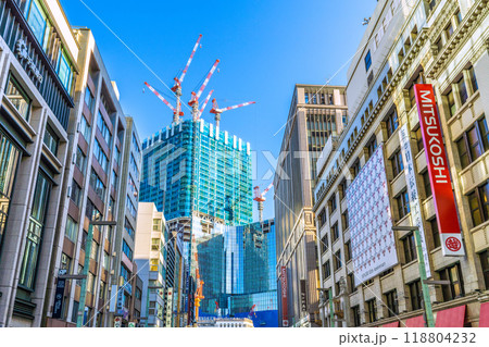 日本の東京都市景観 9月。室町二丁目。コレド室町3(左)や三越。奥は日本橋一丁目の再開発事業
