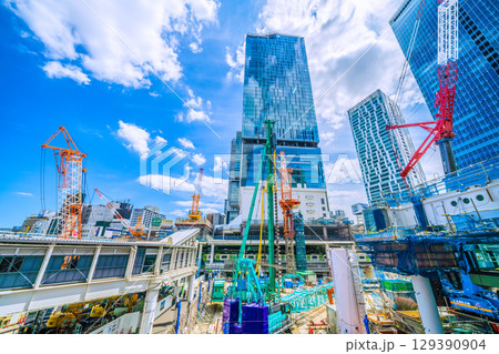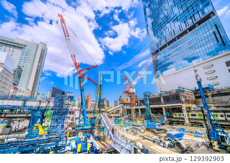 日本の東京都市景観8月5日。猛烈な暑さ…パイルドライバーなどの巨大重機がズラリ…。新章へ…=渋谷