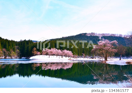 早春残雪に咲く新潟県十日町市津南町中子池の桜