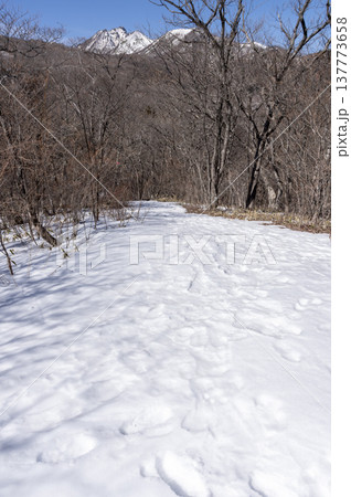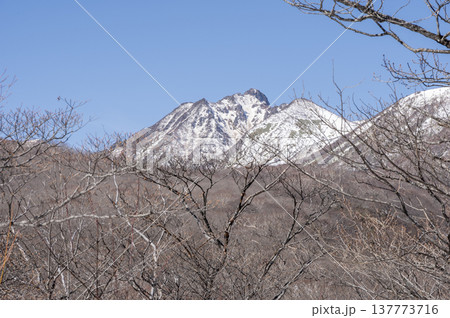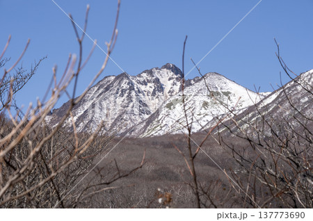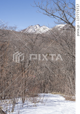 雪残る登山道から望む那須連山・朝日岳の冬景色(栃木県那須町)