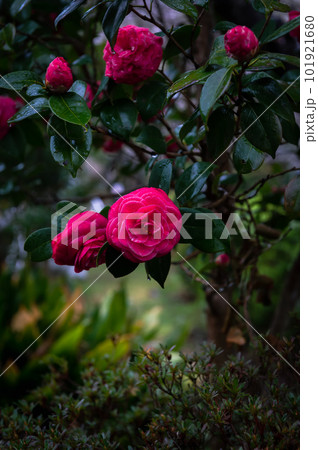 夕景の椿の花、宝塚市、3月26日、日本